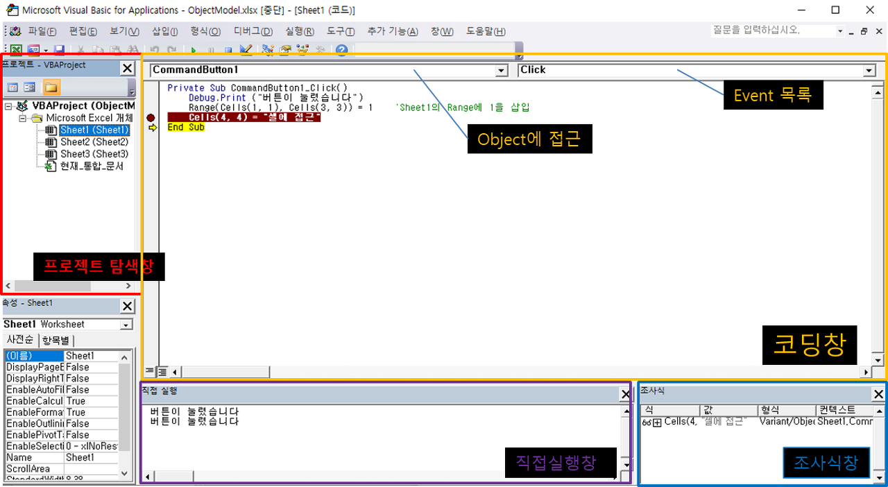 - 조사식창 : 디버깅 시 변수에 어떤 값이 할당되었는지 확인 할 수 있다. 그림을 보면 조사식창에 Cells(4,4)를 추가하였으며 그 값에 "셀에 접근" 이라는 값이 할당된 것을 볼 수 있다.